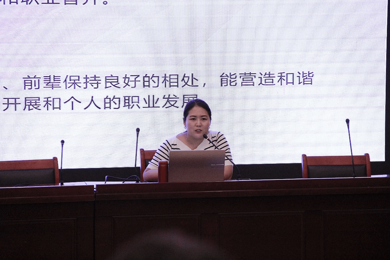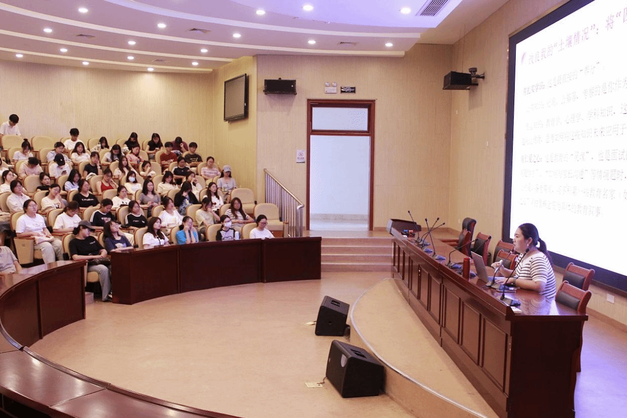 杨晓琦以“引言、扎根、生长、繁茂、结语”为主线,结合个人学习与职业发展经历,系统分享了从员工到教育管理工作者的成长历程与实践思考。她紧扣习近平总书记关于“四有”好老师的重要论述,指出教育工作者不仅应具备扎实的知识能力,更应坚定理想信念、涵养道德情操、践行仁爱之心。在“扎根”部分,她围绕岗位选择、信息获取与面试准备等环节,为同学们提供了切实可行的备考建议,倡导以问题为导向深化学习,实现“学以致用”。