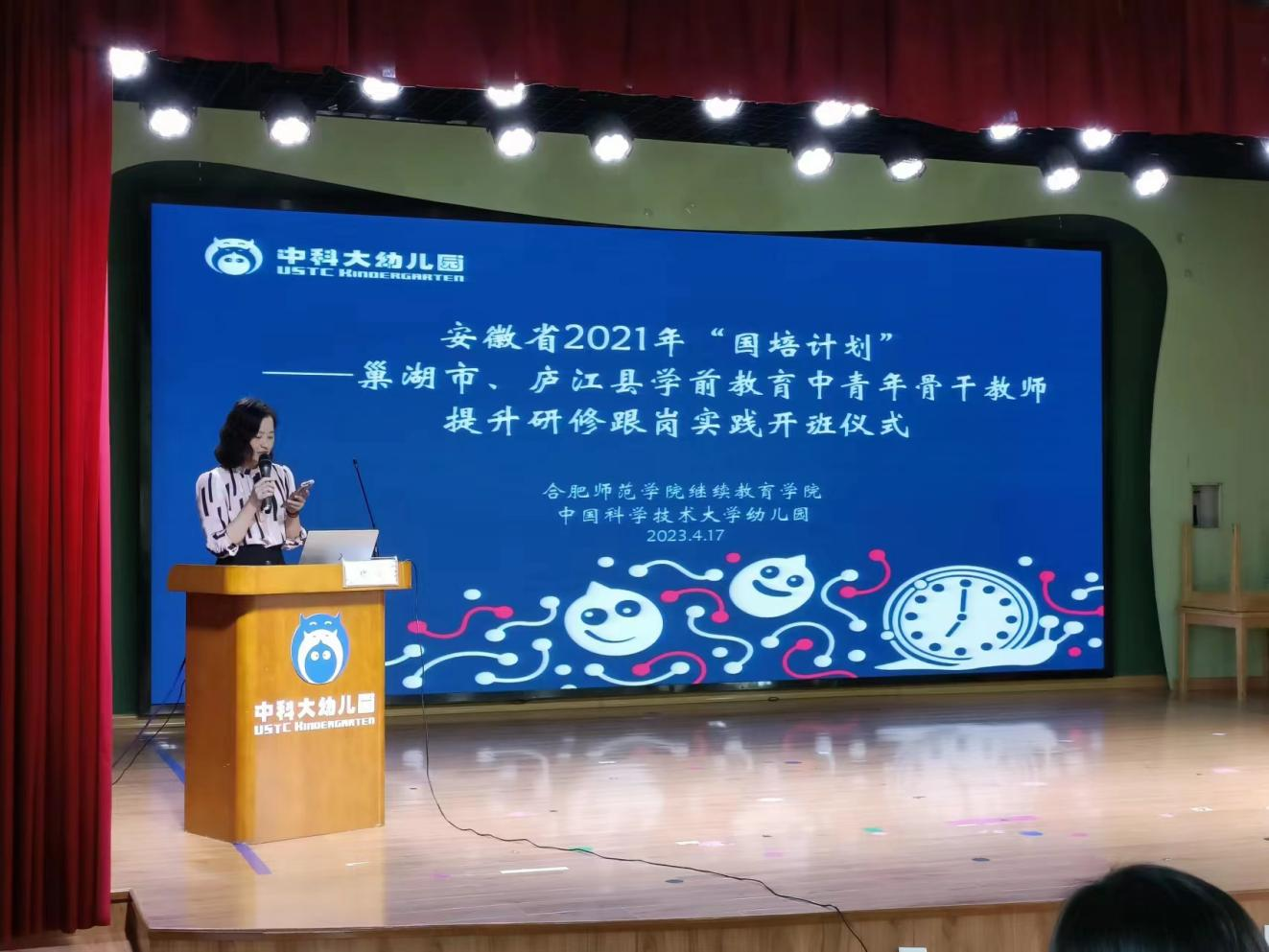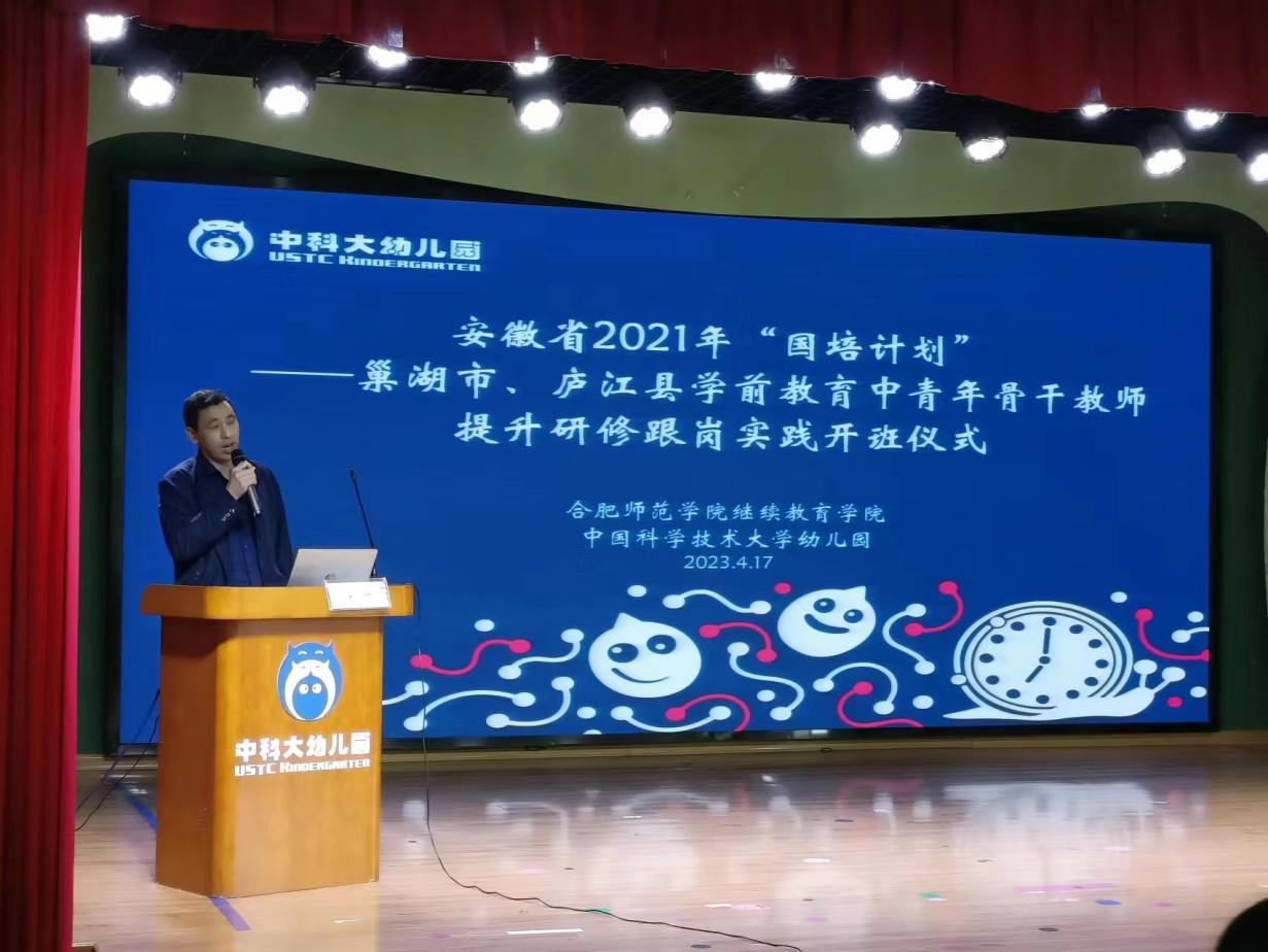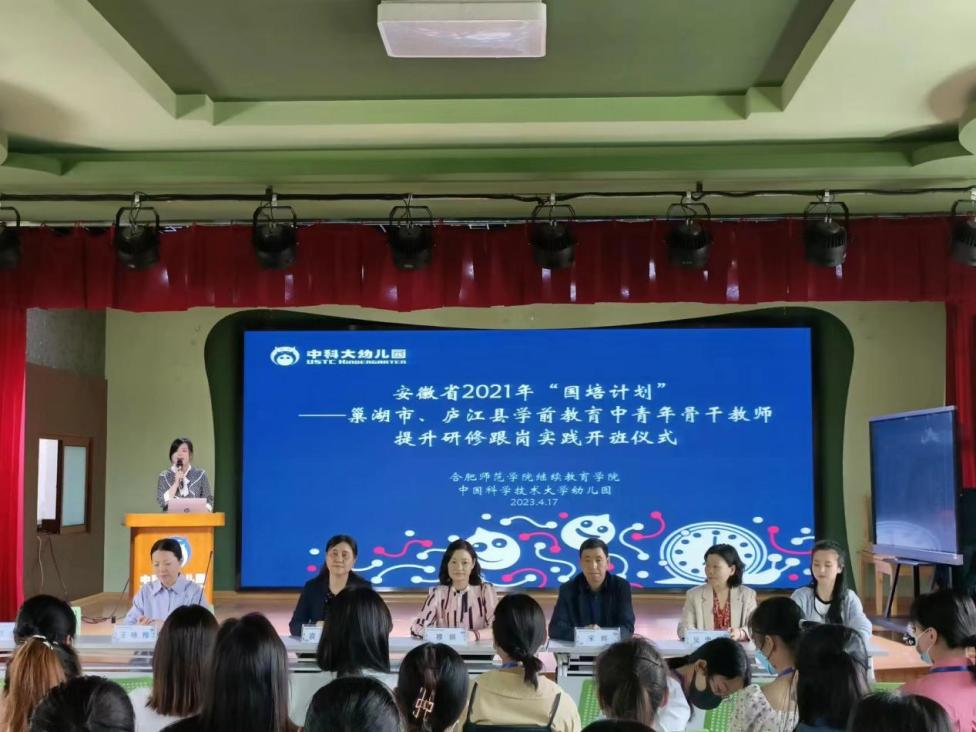 2023年4月17日上午,由William威廉承办的安徽省“国培计划(2021)”——巢湖市、庐江县学前教育中青年骨干教师提升研修跟岗实践班如期在中国科技大学附属幼儿园开班。William威廉官网公司党委书记穆娟、继续教育公司副经理宋辉、William威廉学前教育系吴忠霞、唐银老师,中国科技大学附属幼儿园园长袁洁、业务园长王咏梅、巢湖市、庐江市学前教育中青年骨干教师33人参加了开班仪式。仪式由中国科技大学附属幼儿园业务园长王兰兰主持。