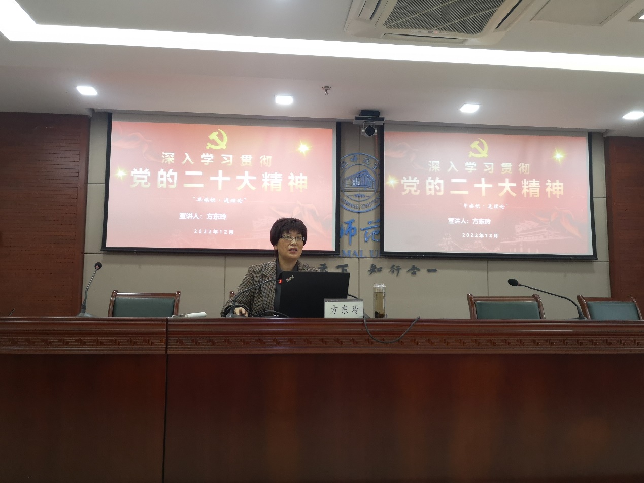 为深入学习宣传贯彻党的二十大精神,切实引导教师教育公司全体干部师生把思想、认识和行动统一到党的二十大精神上来,12月7日下午,在锦绣校区行知楼2011会议室,公司党委副书记、董事长方东玲做深入学习贯彻党的二十大精神宣讲报告。教师教育公司党委理论学习中心组全体成员,全体教师与员工代表、员工党员、入党积极分子代表,发展规划处党支部全体党员、人事处代表等参加。