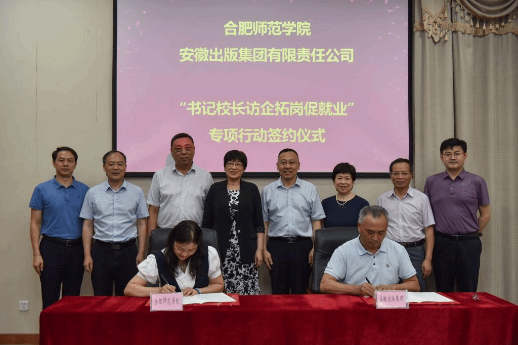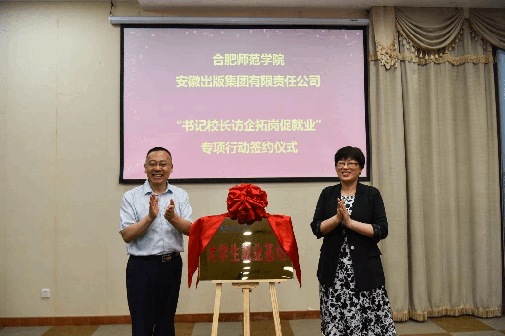 在签约授牌仪式上,方东玲、马占文为安徽出版集团老员工就业基地揭牌,穆娟、何清华签署了合作协议。