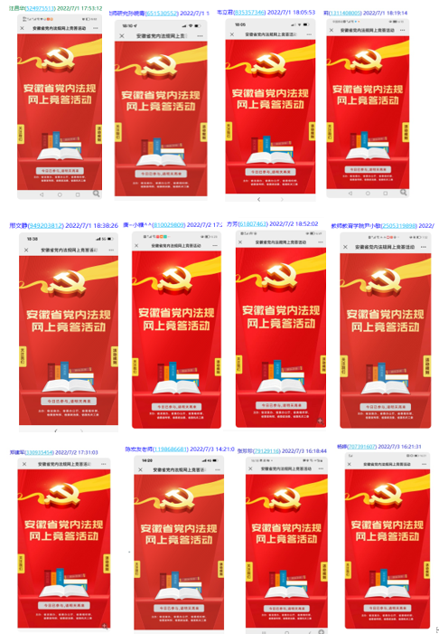 为深入贯彻落实习近平总书记关于依规治党的重要论述精神,结合庆祝“七一”,在合肥师范公司党委和教师教育公司党委的领导下,2022年7月,教师教育公司教育系教工党支部开展党内法规知识网上竞答活动,教育系党支部全体党员积极参加。