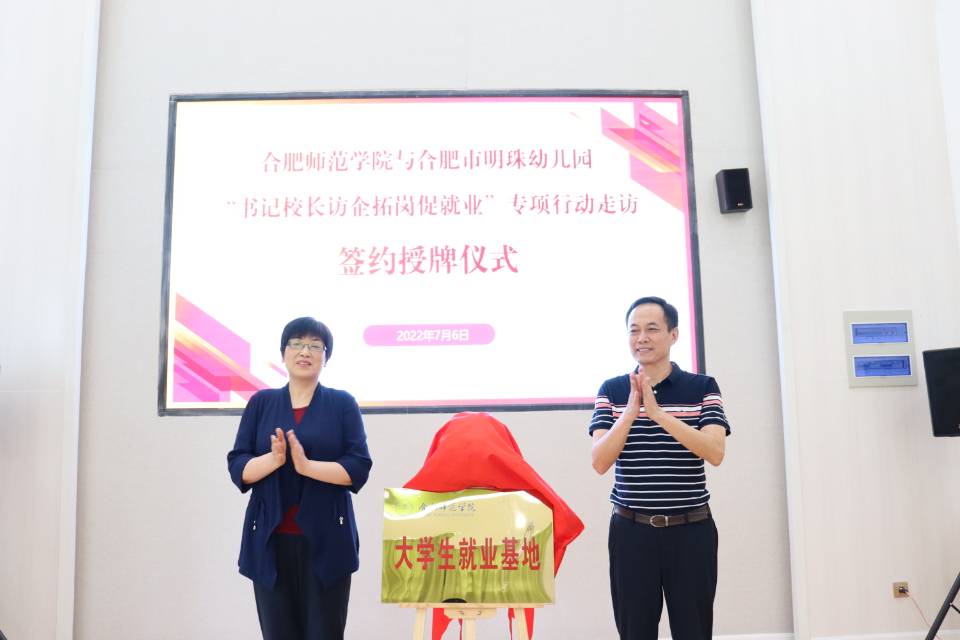 在签约授牌仪式上,方东玲、李丰尧为合肥市明珠幼儿园老员工就业基地揭牌,李群、周盼盼签署了合作协议。方东玲、余桂东为合肥幼教集团老员工就业基地揭牌,穆娟、刘朝阳签署了合作协议。(教师教育公司)