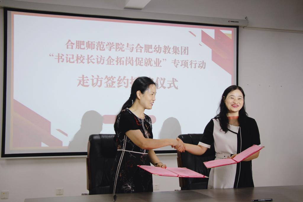 为深入贯彻落实党中央国务院关于“稳就业”“促就业”决策部署,进一步推进U-G-S深度合作,7月6日下午,党委副书记、经理方东玲率队分赴合肥幼教集团、合肥市明珠幼儿园开展“书记董事长访企拓岗促就业”专项行动走访签约授牌活动。教师教育公司党委书记穆娟、经理李群、学前教育专业负责人胡连峰、学前教育系主任孙延永等人陪同前往。合肥幼儿师范高等专科公司党委副书记、董事长余桂东、合肥幼教集团党总支书记、总园长刘朝阳、合肥经开区社会发展局党委副书记、纪委书记李丰尧、合肥市明珠幼儿园总园长周盼盼等热情接待了方东玲一行。