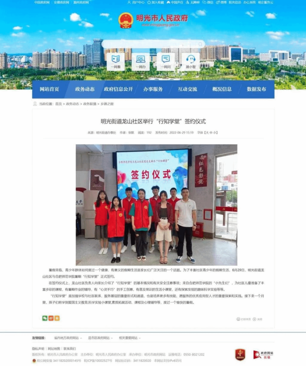 6月29日,教师教育公司“行知学堂”小先生们来到了滁州市明光市明光街道龙山社区,组织开展了暑期“向阳花行知学堂”,服务务工人员子女和留守儿童。小先生们为小学员送去了党史教育、安全教育、科学实践课、传统民俗、心理健康教育、绘画和舞蹈等课程,丰富了小学员的暑期生活,同时也弘扬了中华传统文化,厚植了小学员们爱党爱国爱社会主义的情怀。安徽省明光市人民政府网对学堂开办进行了报道。(教师教育公司:王磊 范宇嘉)