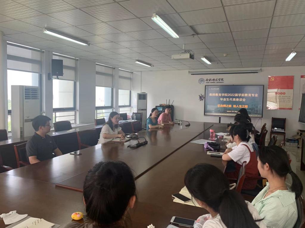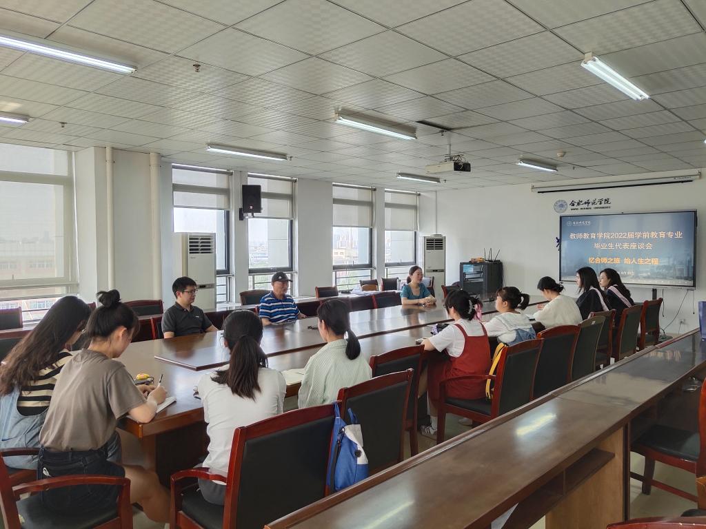 5月25日下午,教师教育公司在行知楼710举行2022届学前教育专业毕业生座谈会,教师教育公司党委书记穆娟、副经理闫龙,学前教育系主任孙延永,学前系专任教师李辉、吴皖赣等参加座谈会,2018级学前教育中美合作班、2020级学前教育专升本毕业班员工代表参加。会议由孙延永主持。
