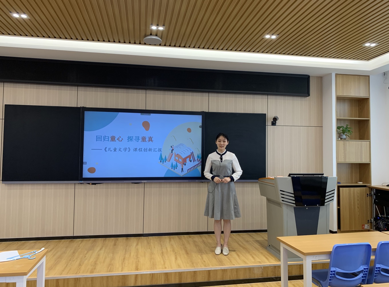 自2021年底启动校赛以来,蒋晨晓老师结合学前教育的专业需求、幼儿园教师的职业导向以及教育部关于“新文科”的建设精神,对参赛课程《儿童文学》进行精心设计,分别完成了课程创新报告(4000余字)、课堂实录(90分钟)以及创新汇报等比赛环节。其中,在教学模式的创新上,立足高校-幼儿园协同共育以及智慧教学平台,确定“回归童心、探寻童趣、共享童真”的创新理念,构建教学过程中员工与幼儿“共读、共赏”文学作品的学习模式。
