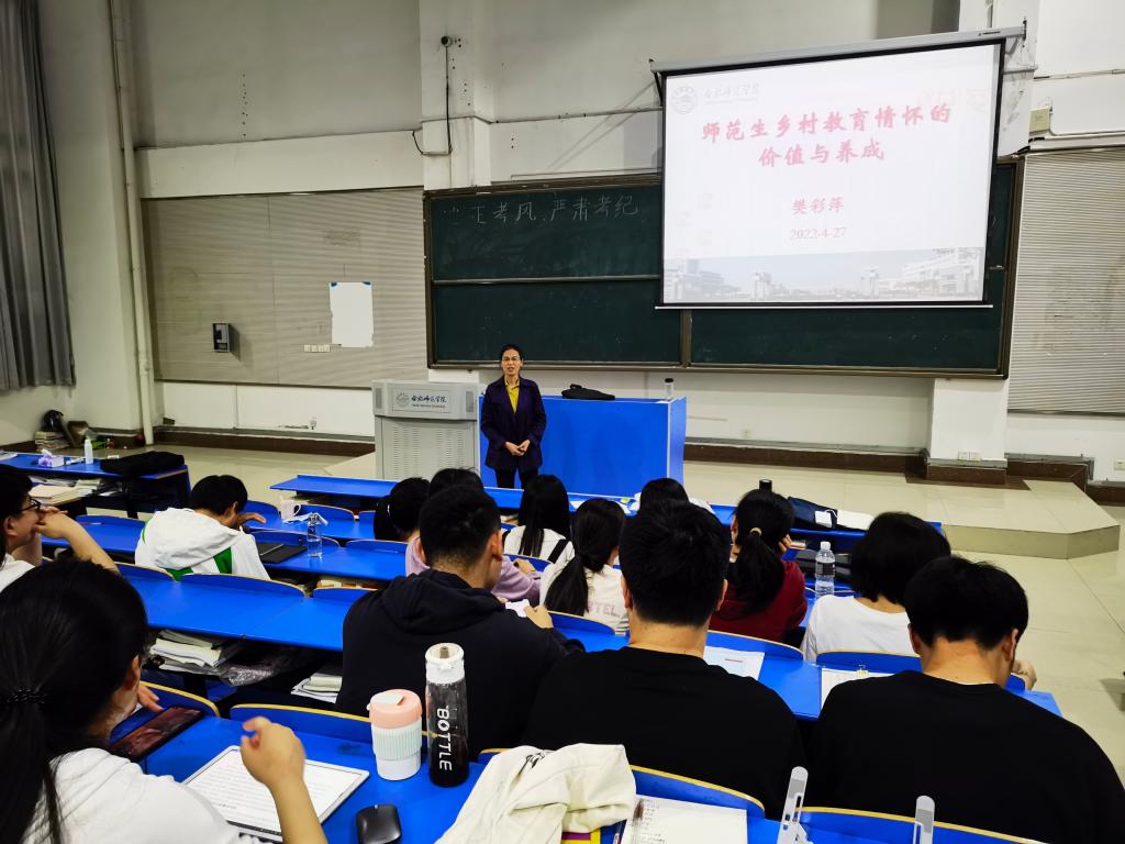 (本网讯)教师教育公司小学教育专业员工是定向招收、定向培养、定向就业的未来乡村教师。为促进员工增强乡村从教意愿、坚定乡村从教信念,4月27日下午,教师教育公司在锦绣校区逸夫楼西阶一教室举办了题为“师范生乡村教育情怀的价值与养成”的学术讲座。讲座由教师教育公司研究员樊彩萍主讲,2018级、2019级小教专业员工参加学习、交流。