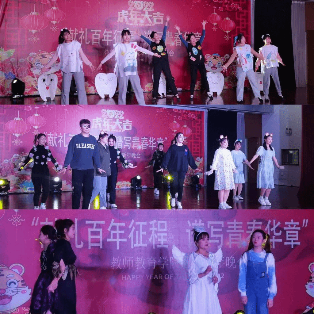 本场晚会为教师教育公司学子们全方位展示师范生技能提供了舞台。其间,教师教育公司合唱社团带来的《英雄赞歌》与《梨花又开放》,表达了同学们对英雄们的崇高敬仰,为大家展示了梨花漫天飞扬的美好故乡画面。空竹社团带来的《空竹展示秀》,弘扬了中国传统文化,高超的技术让台下的观众热血澎湃。穆娟、李群与王磊老师的朗诵《百年荣光》,回望了党波澜壮阔的百年征程,党带领着人民风雨兼程、砥砺前行,才成就了如今这百年的辉煌。作品诉说了对革命先烈们的敬佩、崇拜与感恩之情,表达了对党的无限热爱,将现场气氛推入了高潮。最终,在古典舞与拉丁舞结合的《我爱你中国》中本场晚会圆满落幕,现场所有师生一起合影留念。