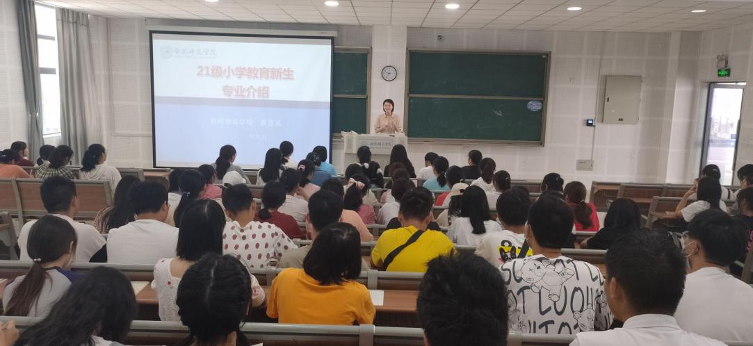 (本网讯)9月8日上午9点30分,教师教育公司在滨湖校区博学楼A108召开2021级小学教育新生专业介绍会,教育系邓珍珍老师主讲,2021级小学教育全体员工参加。