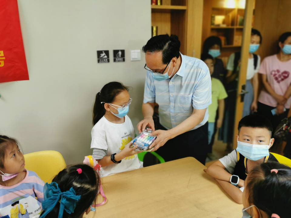 【本网讯】7月16日,党委委员、副经理姚本先在教师教育公司党委书记穆娟、副经理闫龙和该院辅导员的陪同下前往锦绣社区,看望慰问“共享悦书房”行知学堂的小先生和小学员们。锦绣社区党委副书记徐新建、社区团委书记刘小雨、蓬莱居委会党支部书记范仁胜等热情接待了姚本先一行。