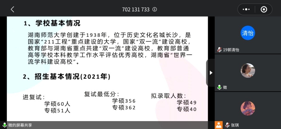 考研交流会由成功考取浙江师范大学、北京师范大学和湖南师范大学的心理学方向研究生的程慧、刘文婕、刘海燕3位2017级同学通过腾讯会议的方式交流分享考研心得。3位同学结合个人经历,从前期规划准备、录取公司介绍、复习参考书目、学习流程和策略、实际作战经验和教训、良好的考研心态等方面进行了详细地讲解。3位同学还对大家现场的疑问做了一一解答。