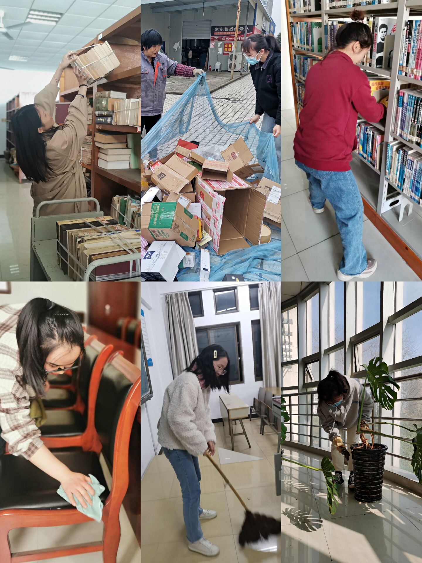 根据实施方案要求,锦绣校区2020级员工晚自习后认真做好分配教室的清理工作,教室内及时张贴班级值日表,各班负责打扫卫生的同学认真完成打扫、清理等相关工作。在校园安保工作中,员工们按照保卫处统一安排,认真做好公司瑶海区“四进一促”暨招才引智专场招聘会期间的校园安保工作。滨湖校区图书馆内,2019级非师范专业员工在图书馆教师的指导下认真编排摆放整理图书。教师教育公司的员工们积极参与劳动教育课程,工作秩序井然,顺利完成了各项任务。