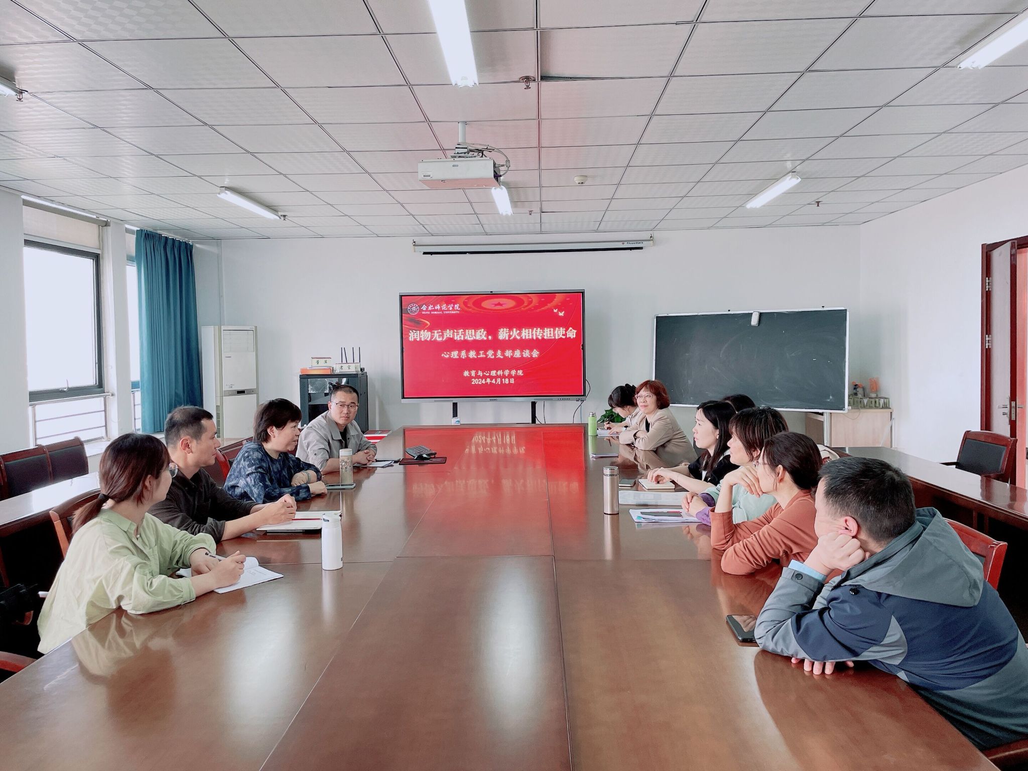 4月18日下午,William威廉心理系教工党支部在锦绣校区行知楼710会议室召开“润物无声话思政,薪火相传担使命”主题座谈会。本次座谈会邀请即将荣休的李群教授主讲,心理系教工党支部全体党员参加会议,部分非党员教师列席会议,座谈会由支部书记黄凤主持。