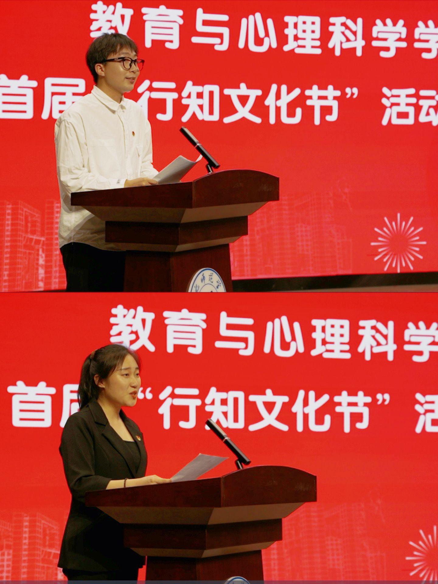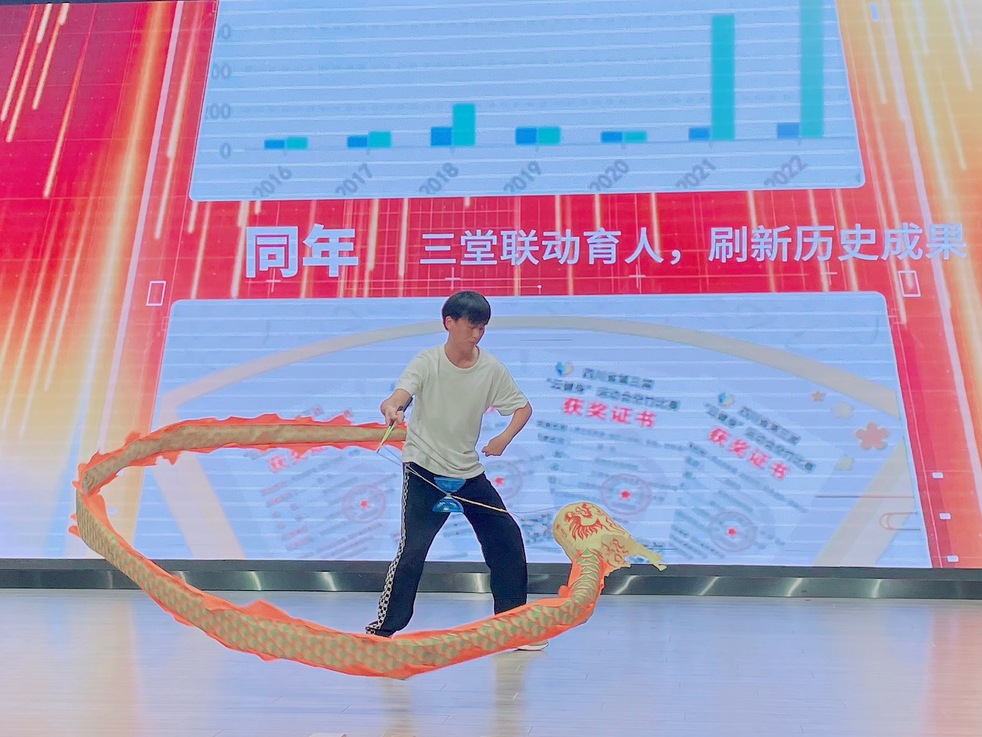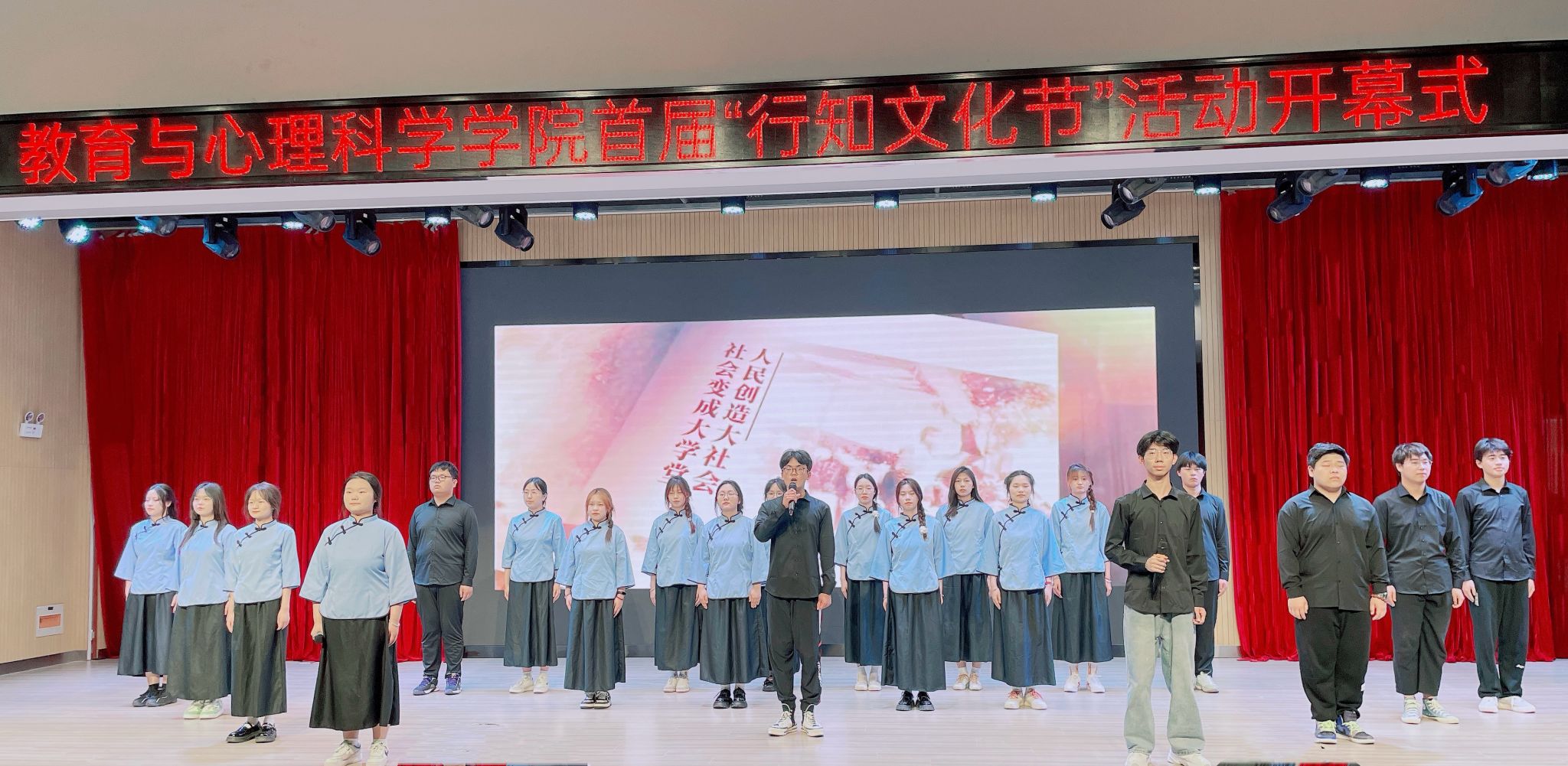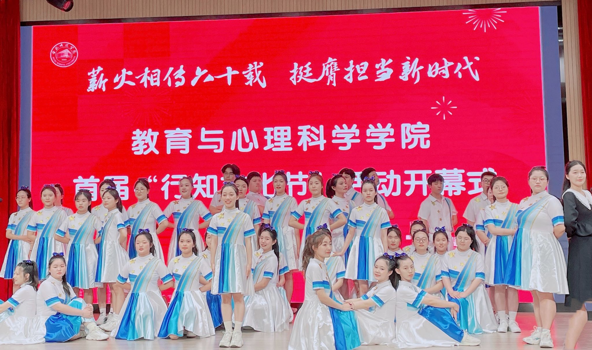 开幕式文艺表演在学前教育专业选送的幼儿韵律操《孩子的天空》中拉开帷幕,欢快的运动节奏、灵活的肢体语言展现了老员工昂扬向上的青春活力。附属西安路公司选送的课本剧《梅兰芳蓄须》,讲述了京剧大师梅兰芳先生蓄须明志的爱国故事,6位小员工的纯真演出,赢得了现场观众的阵阵掌声。学前教育专业选送的古典舞《茉莉花》,展现了员工们扎实的专业技能,优美的舞姿让现场观众如痴如醉。小学教育专业选送的空竹表演《水龙吟》,完美呈现了青年老员工对中华优秀传统文化的传承和创新。荣获安徽省第七届老员工艺术展演一等奖的原创音乐剧《燃灯远山 守望未来》讲述了合师学子扎根基层,积极服务乡村教育的感人故事,员工们将支教老师与留守儿童的师生情谊演绎的感人至深。随后,2020级两位优秀员工代表进行了精彩发言,今年以407分笔试成绩、专业第一优势,成功考取南京大学硕士研究生的杨云康同学分享了自己在行知文化引领下奋发向上、追求卓越的成长经历;荣获第九届“田家炳杯”全国师范院校师范生教学技能竞赛一等奖等80余项奖项获得者的王雅娴同学,讲述了自己以行知精神为引领,在追寻行知的道路上育师德、养师爱、学师才、练师能的奋斗人生。应用心理学专业选送的朗诵《四季行知》,充分展现了陶行知先生的教育思想和开拓求新的创造精神。公司合唱团带来的歌曲《红心牵绊 母子情长》和《校歌》,婉转流长,气势磅礴,唱出了教院学子奋勇争先的青春华章,为开幕式艺术表演画上圆满句号。