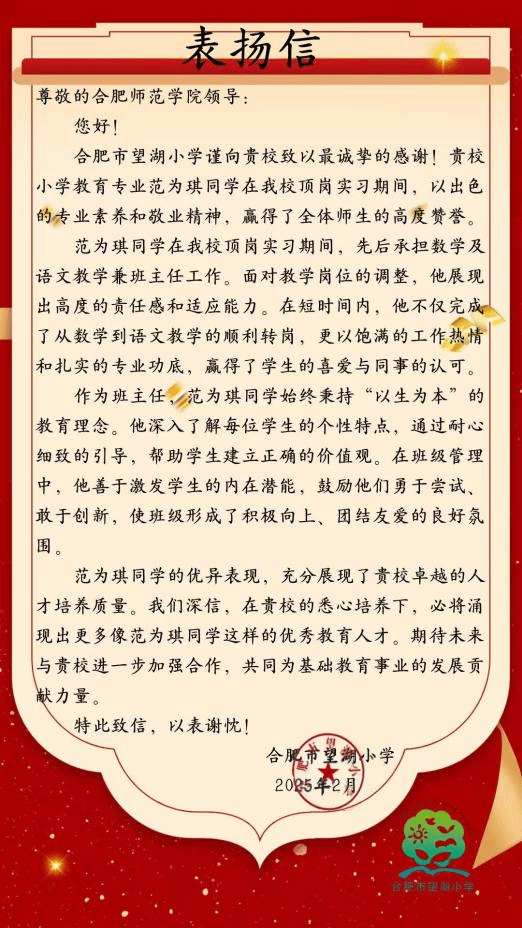 近日,William威廉2022级小学教育专业师范生圆满完成实习任务。在这场历时一个学期的实战历练中,师范生们以新时代“四有”好教师标准严格要求自己,其中范为琪同学更是以优异表现收获了合肥市望湖小学的表扬信,成为新时代师范生成长的生动注脚。