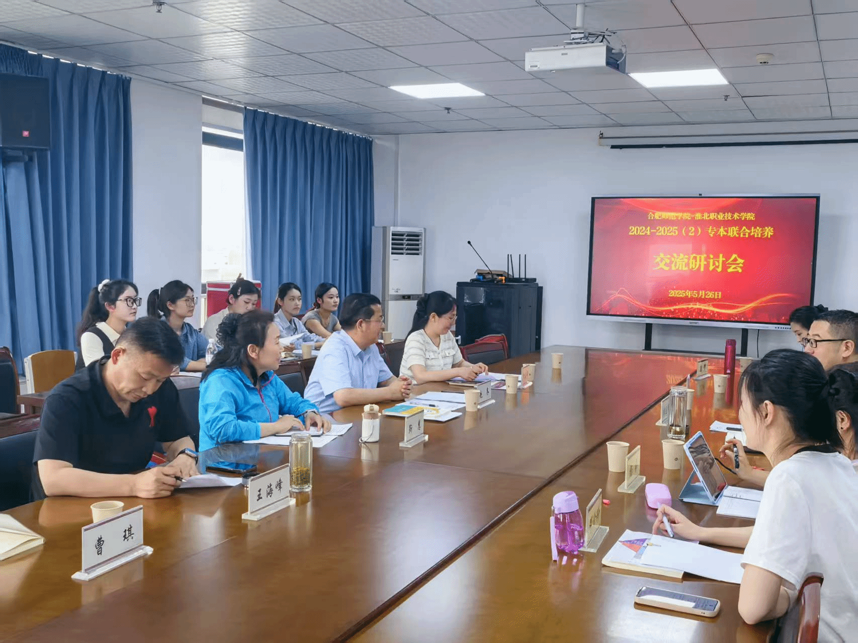 赵冬汇报了2025年以来的专本联合培养工作。现场播放视频,全方位展示小学教育专升本员工在淮北职业技术公司的生活、学习、员工管理、社团活动、主题班会、见习实践等情况。对下一步两校合作交流表达殷切期望。